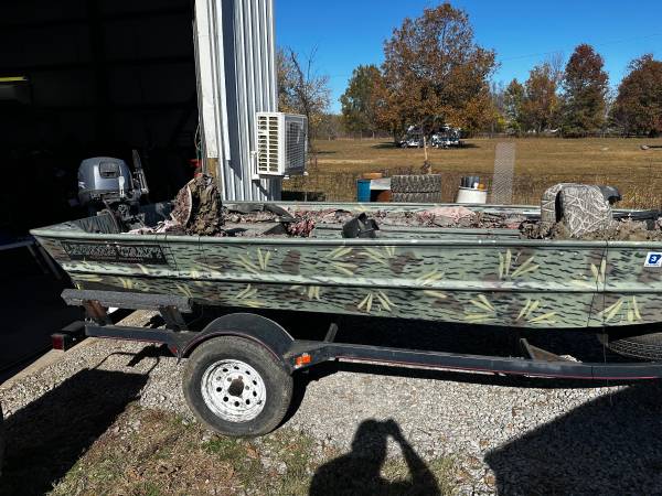 It has a 3 bank battery charger, Avery mountable duck blind, and Minnkota riptide trolling motor included with it.