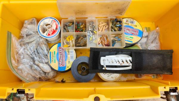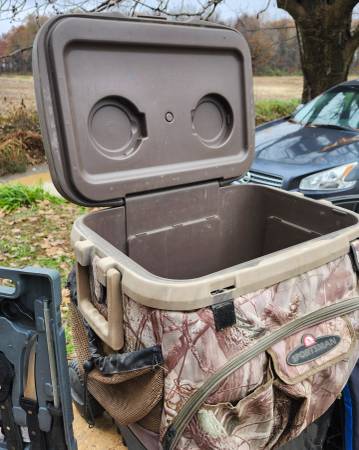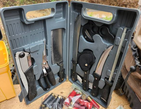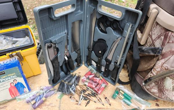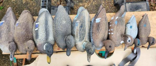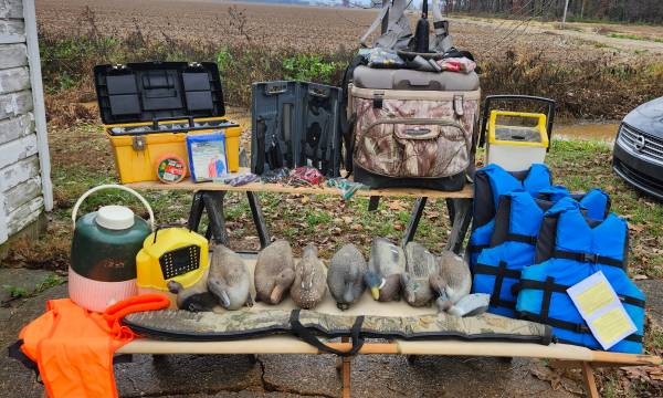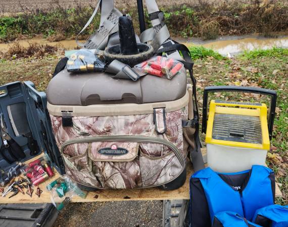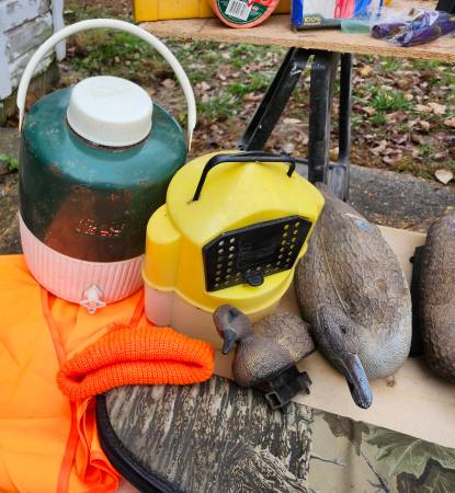 Selling all together: 9 duck decoys, 4 new adult Onyx life vests, 1 deer hunting tree harness, 1 Realtree cloth gun carrying case, 1 old Coleman water cooler(Very clean), 1 hunter orange vest & cap & roll of duct tape, 1 boat anchor, 1 camaflouge hunters cooler on wheels with storage pockets, 1 wooden & canvas foldable sleeping cot, 2 bait containers, 1 tackle box full of tackle, arrow broadheads and practice tips, 1 field cleaning kit, and 1 rain poncho. DO NOT TEXT ME TO EMAIL YOU. I WILL ONLY TAKE CALLS.