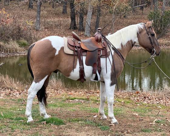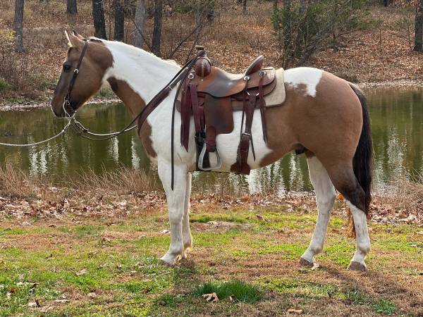 Pinto is a 7 year old gelding that catches everyone’s eye with his color. He is soft in the face, nice stop, and easy to ride. He will be a great horse to put to work. He will go down trails, ride indoor or outdoor arena. He will load/unload no problem, good for baths, easy to saddle. He’s more go than woah when u first get on then he’s more woah than go after he settles. No buck, bite, or kick.