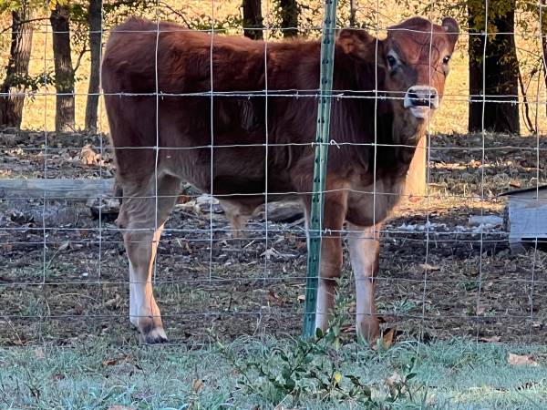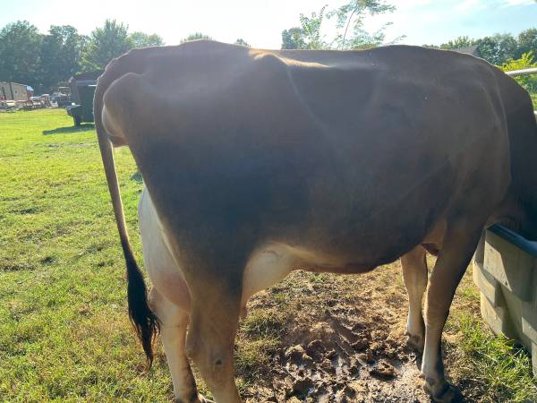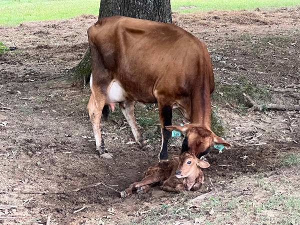 Molly ~ A2/A2 ~ Disease Tested ~ Nurse Cow at the moment ~ Registered Jersey USA 067490560 ~ Freshened in August 2025 ~ Chrome Bull Calf (registrable) ~ Exposed to Dexter Bull (homo polled and A2/A2) ~ Potential HIGH producer ~ Calved unassisted ~ Halter Broke ~ Stanchion Trained ~ Hand or Machine milked
