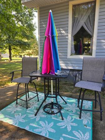 Like new, no dents, tall table, 2 chairs, umbrella, and stand.